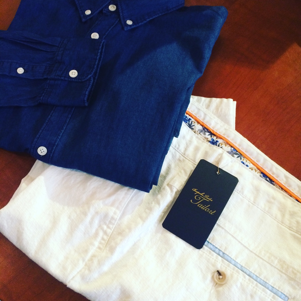 インディゴシャツと白のハーフパンツは暑い季節にぴったりの色合いですよね。